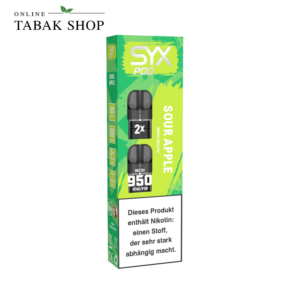 Vorgefüllter Pod für das SYX Podsystem mit dem Geschmack Sour Apple. Enthält 20 mg Nikotin.
