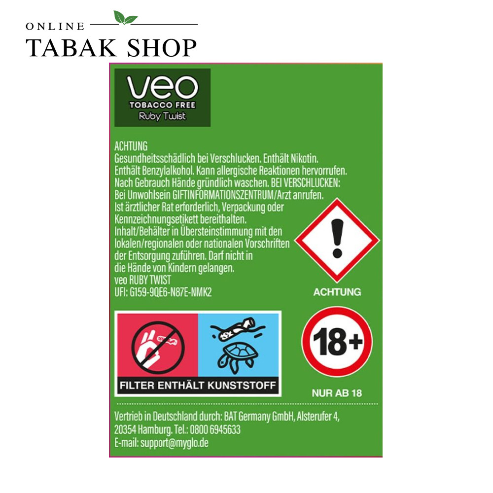 Die VEO Ruby Twist Sticks sind eine besonders frische, fruchtige Variante der tabakfreien VEO-Reihe für glo. Die Sticks basieren auf einem pflanzlichen Rooibos-Substrat statt Tabak und werden im glo Gerät erhitzt, nicht verbrannt. So entsteht ein aromatischer Dampf ohne Asche.