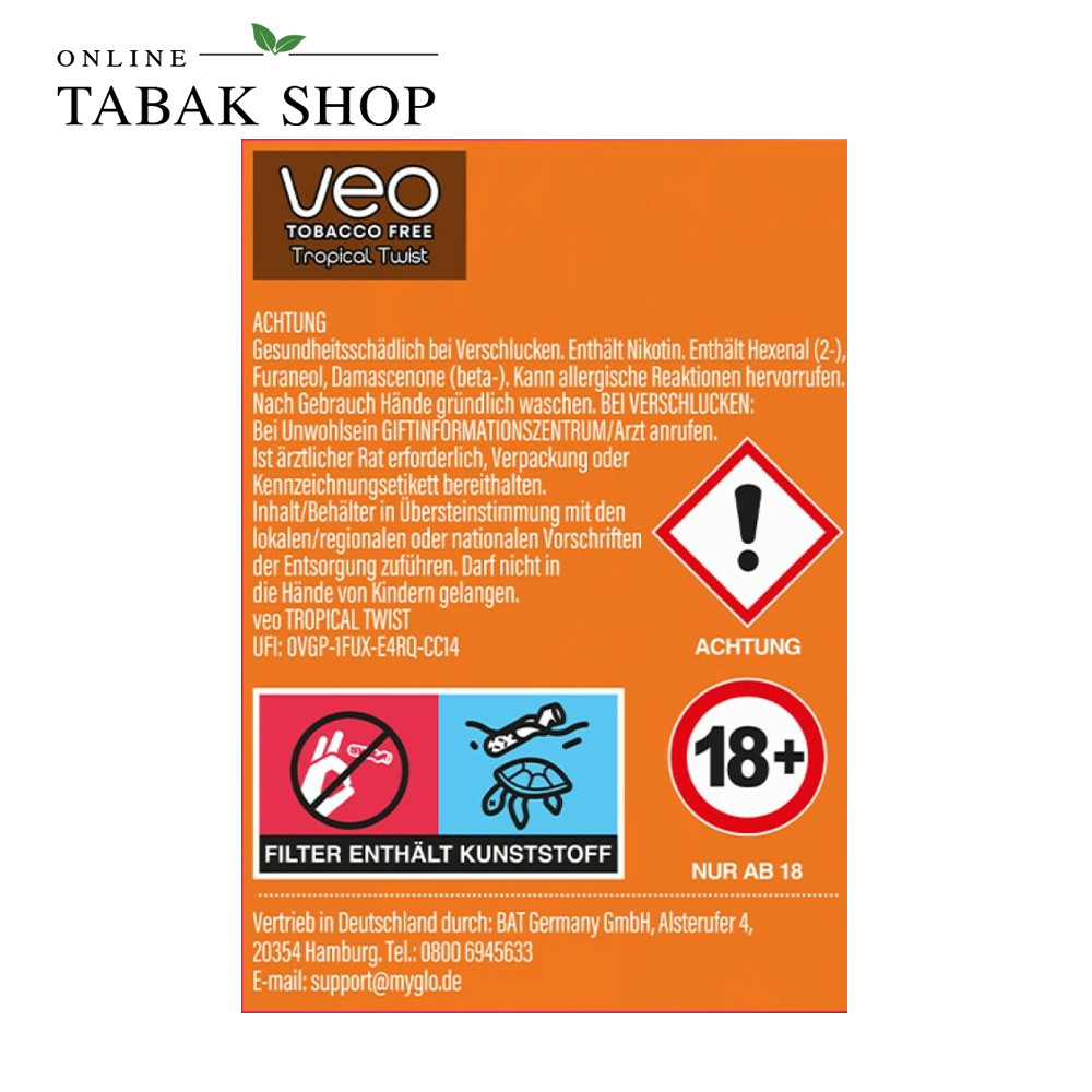Die VEO Tropical Twist Sticks sind die tropisch-fruchtige Variante der tabakfreien VEO-Reihe für glo. Die Sticks basieren auf einem pflanzlichen Rooibos-Substrat statt Tabak und werden im glo Gerät erhitzt, nicht verbrannt. So entsteht ein aromatischer Dampf ohne Asche.
