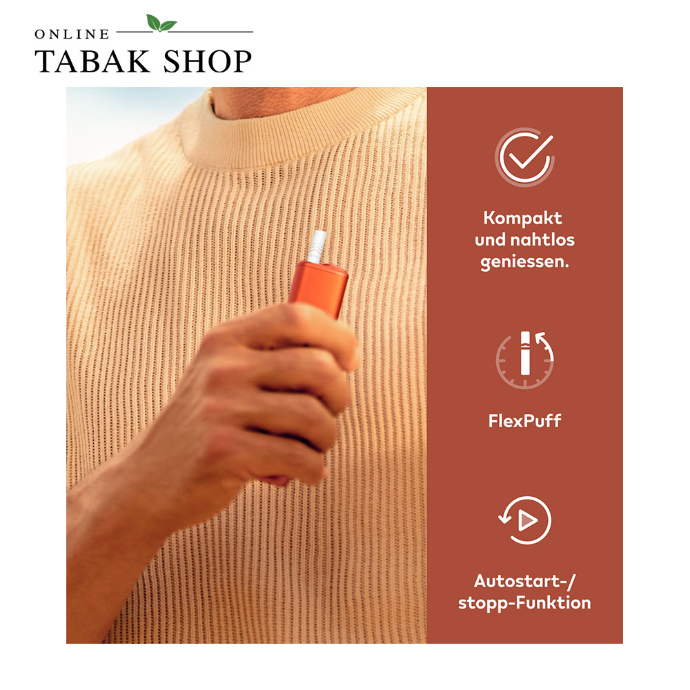Der IQOS ILUMA i ONE Vivid Terracotta verbindet präzise Induktionstechnologie mit einem schlanken All-in-One-Aufbau für den mobilen Einsatz. Der Tabak wird durch das SMARTCORE INDUCTION SYSTEM™ gleichmäßig von innen erhitzt – ohne Rauch, ohne Asche und ohne Reinigungsaufwand. Das Gehäuse in Vivid Terracotta bietet eine warme, matte Farbgebung mit hochwertiger Haptik. Bis zu 20 Nutzungen pro voller Ladung, Autostart beim Einsetzen des Sticks und eine klare LED-Rückmeldung sorgen für ein unkompliziertes Handling im Alltag. Der Fokus liegt auf Robustheit, einfacher Bedienung und einem konstanten Geschmackserlebnis – ideal für alle, die unterwegs ein wartungsfreies System bevorzugen.
