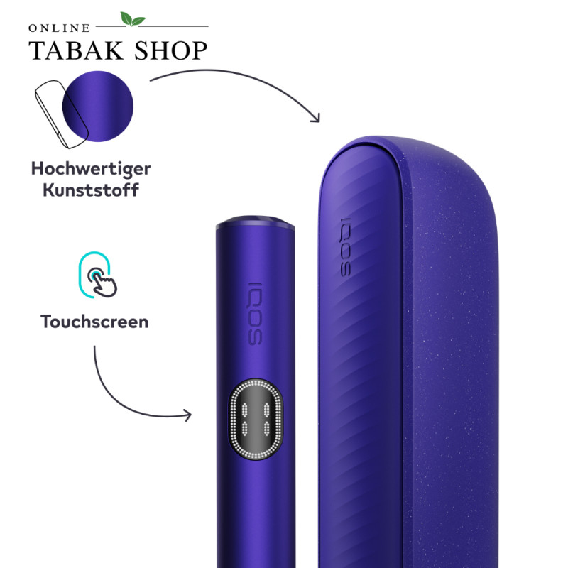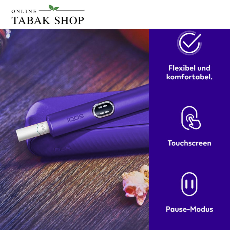 Das IQOS ILUMA i in der Trendfarbe Electric Purple ist die fortschrittlichste Generation der ILUMA Serie. Es kombiniert die bewährte Smartcore-Induktionstechnologie (ohne Rauch, Asche oder Reinigung) mit einem völlig neuen, zweiteiligen Premium-Design aus Pocket Charger und Holder. Das Highlight: Über das integrierte Touch-Display am Holder steuern Sie smarte Funktionen wie den neuen Pause-Modus oder die Akkuleistung flexibel selbst. Perfekt für alle, die maximale Kontrolle, erstklassiges Design und ein individuell anpassbares Geschmackserlebnis suchen.