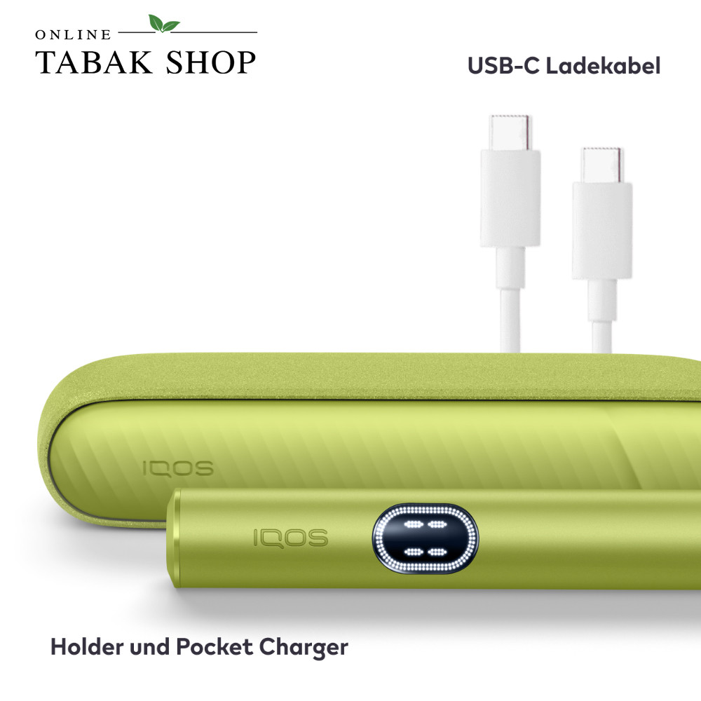 - Lieferumfang: 1x IQOS ILUMA i Pocket Charger, 1x Holder (Leaf Green), 1x USB-C-Ladekabel, Anleitung & Garantiekarte