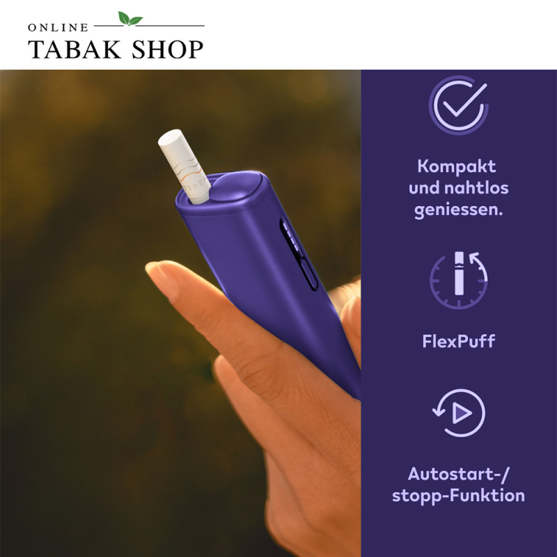 Der IQOS ILUMA i ONE in der Trendfarbe des Jahres Electric Purple ist das kompakteste Format der ILUMA i Serie. Er verbindet fortschrittliche Smartcore-Induktionstechnologie mit maximaler Mobilität. Das bedeutet für Sie: echter Tabakgeschmack, der gleichmäßig von innen erhitzt wird – komplett ohne Rauch, Asche oder lästiges Reinigen. Dank integriertem Akku für bis zu 20 Nutzungen und smarten Funktionen wie Autostart und Zuganpassung ist dieses All-in-One-Gerät der perfekte, wartungsfreie Begleiter für unterwegs.