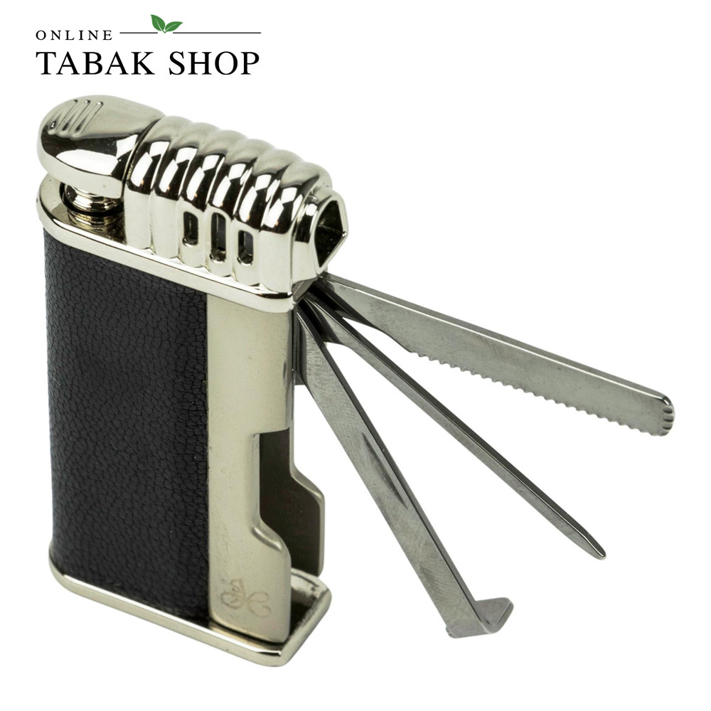 Im Feuerzeug ist ein kleines Pfeifenbesteck integriert, das unterwegs schnell griffbereit ist (z. B. zum Stopfen oder für kleine Anpassungen beim Rauchen).