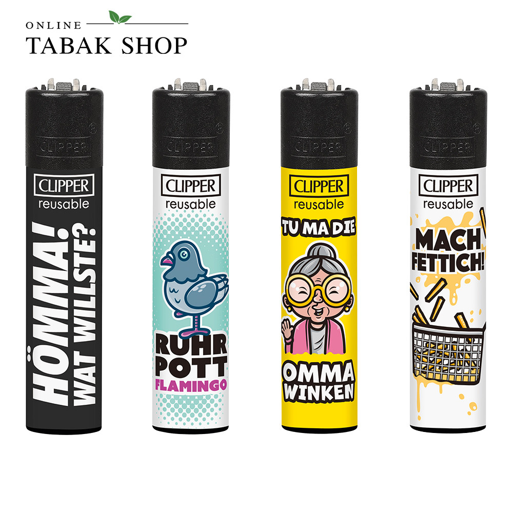 Mit dem Clipper Classic „Ruhrpott“ 4er-Set bekommst du Feuerzeuge mit echtem Ruhrpottgefühl. Direkt, herzlich und mit einem Augenzwinkern – genau so, wie man es aus dem Ruhrpott kennt.
