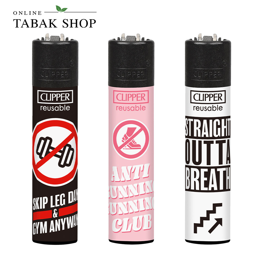 Drei originale Clipper Classic Feuerzeuge mit ironischen Anti-Sport-Sprüchen. Perfekt für alle, die Training lieber beobachten als selbst machen. Alle Motive einmal enthalten.