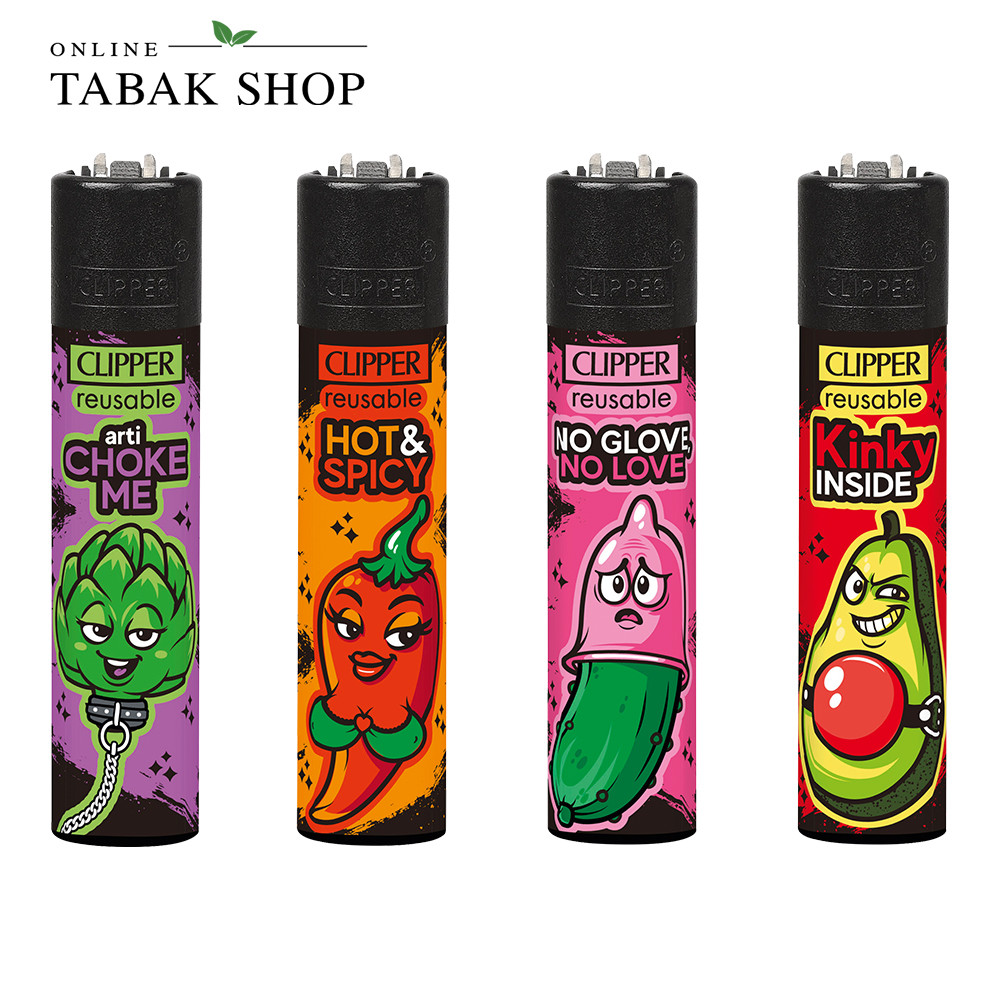 Vier Clipper Classic Porn Slogan 9 Feuerzeuge mit frechen Statements und Gemüsemotiven im klassischen Clipper-Format – perfekt als Set für Partys, den Alltag oder zum Sammeln.