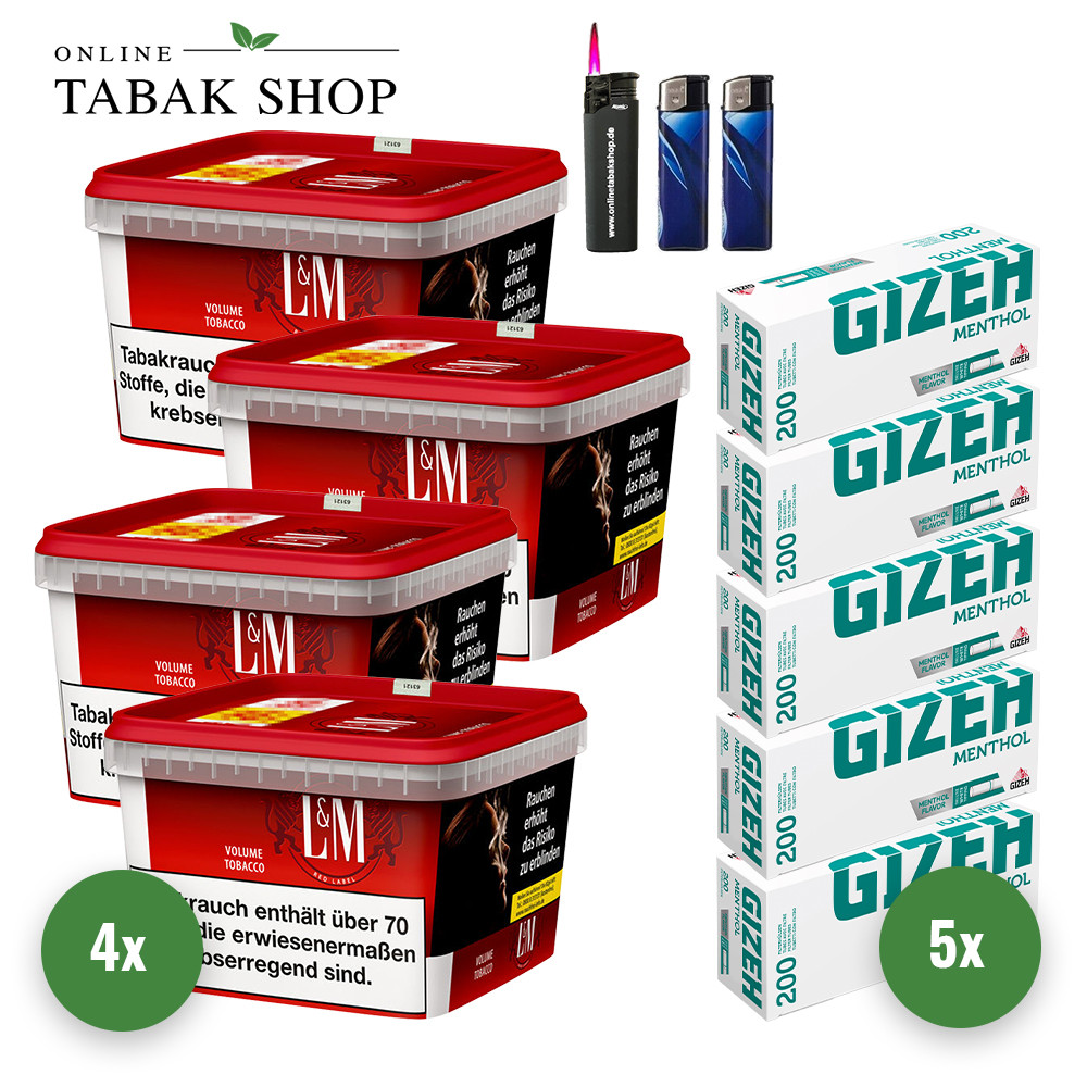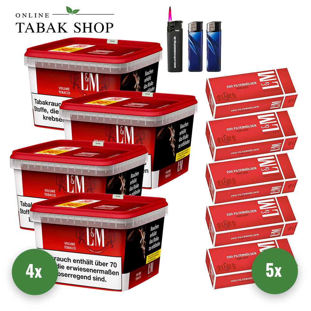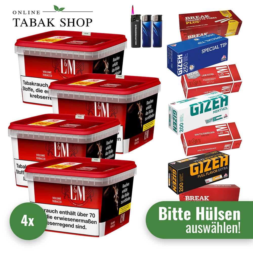 4x L&M Tabak Rot 120g Mega Eimer + 1000 Hülsen (Sorte wählbar) + 2 Feuerzeuge + 1 Sturmfeuerzeug