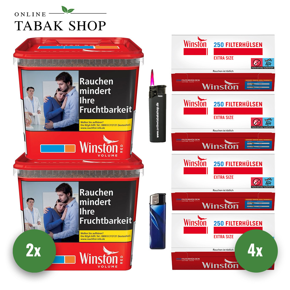 Winston Tabak Rot (2 x 250g) + 1000 Hülsen + Feuerzeuge Sparpaket