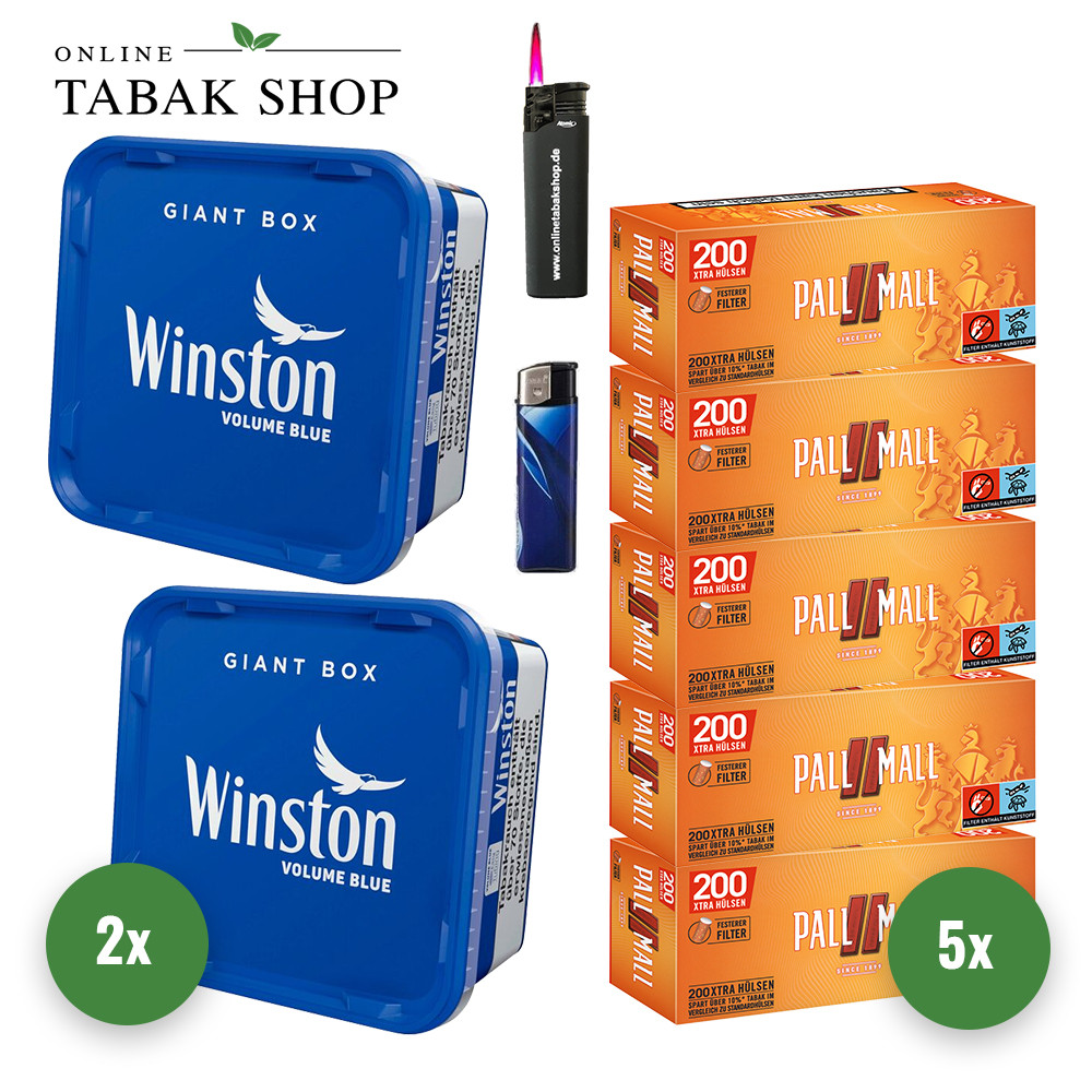 Winston Blue (2 x 165g) + 1.000 Hülsen + 1 Sturmfeuerzeug + 1 Feuerzeug