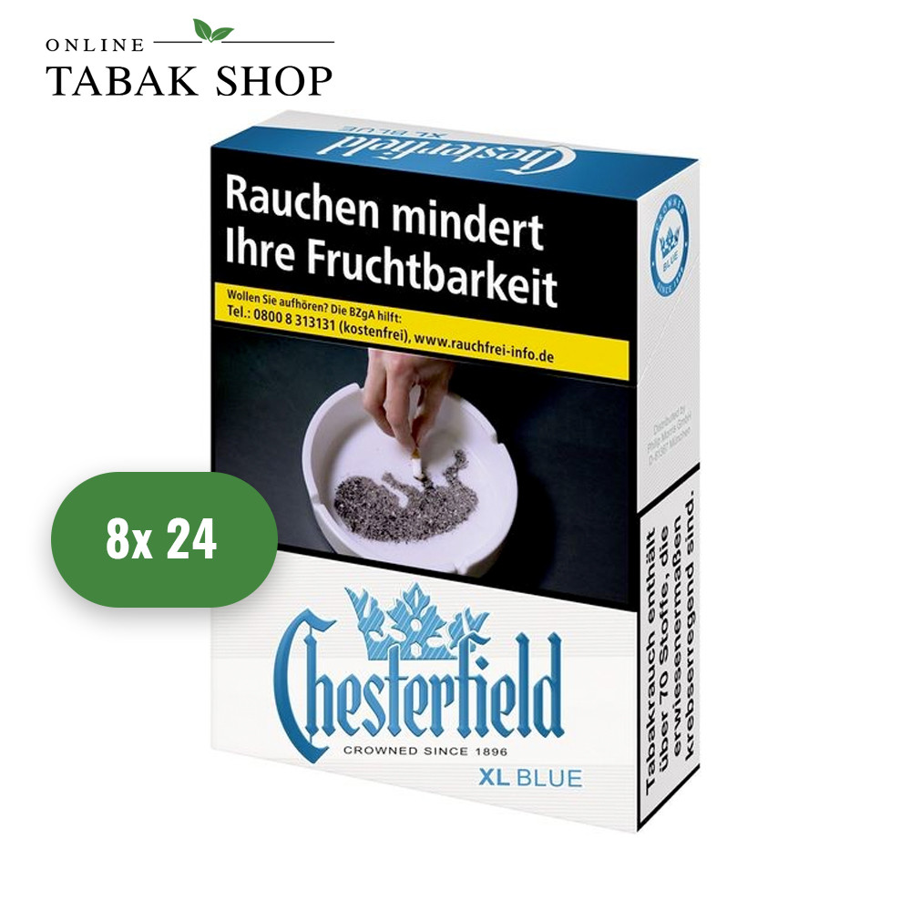 Die Chesterfield Blue/Blau Zigaretten sind im Gegenteil zu den Red Zigaretten deutlich milder, welches man ebenfalls an den Werten erkennen kann. Raucher, die einen weichen und geschmeidigen Geschmack in ihrer Zigarette bevorzugen, liegen bei den Chesterfield Blue Zigaretten genau richtig. Die American Blend Tabakmischung hat einen robusten und cremigen jedoch delikaten Geschmack. Überzeugen Sie sich selber mit der milden Variante der Chesterfield Zigaretten. Chesterfield Blue in der Packungsgröße XL (8 x 24er) ist erhältlich im Online Tabak Shop.