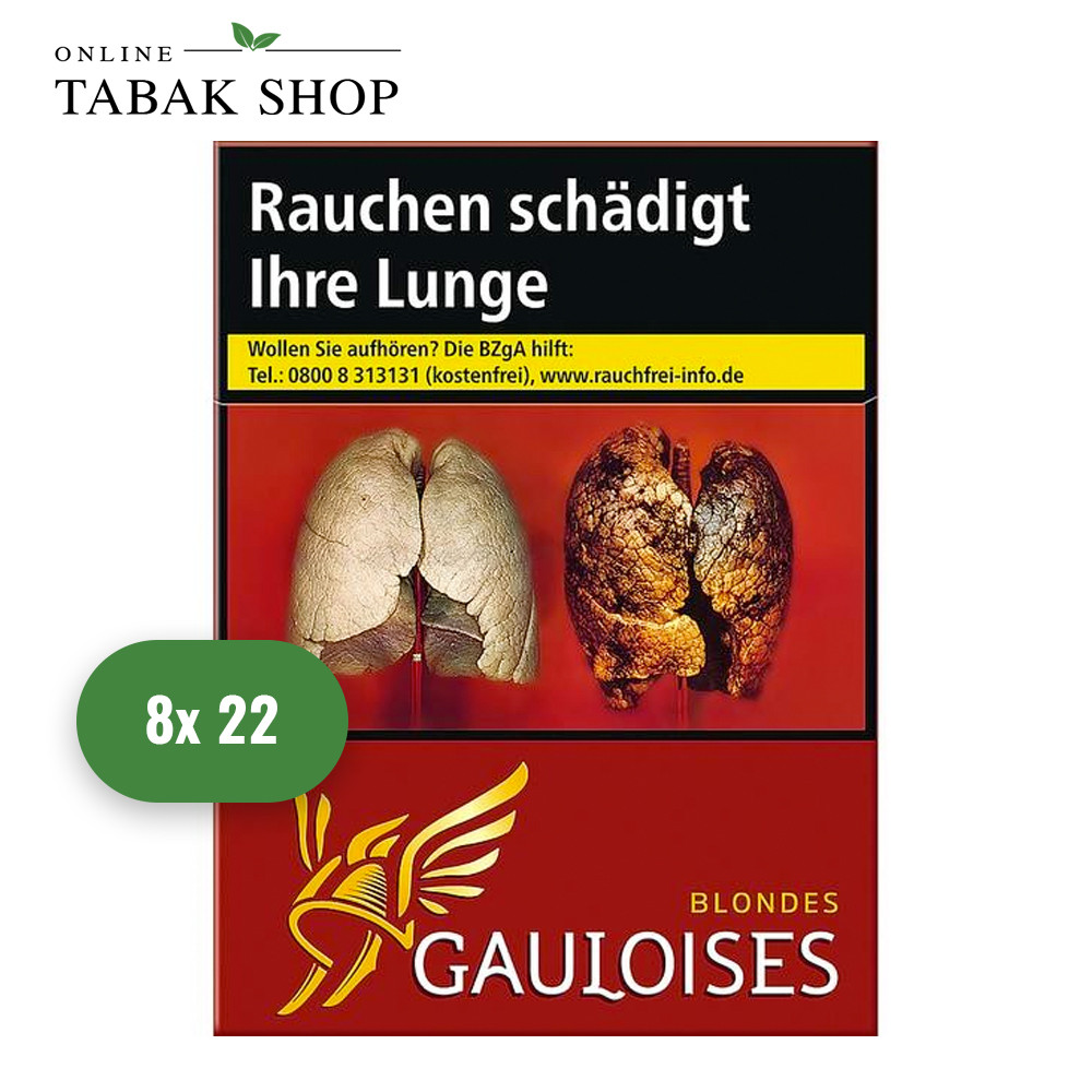 Die Gauloises Blondes Rot Zigaretten sind im Gegensatz zu den blauen Gauloises die leichtere Variante. Die erlesenen Tabake sorgen für ein mildes Geschmackserlebnis und einen aromatischen Geschmack. Mit einem Nikotinwert von 0,6 mg, lässt sich die Zigarette als mittel-stark einstufen. Die Blondes Rot Zigaretten eignen sich demnach perfekt für Raucher, die ein leichtes bis mittelstarkes Raucherlebnis bevorzugen. Überzeugen Sie sich selbst und machen Sie die Gauloises Blondes Rot Zigaretten zu ihren persönlichen Favoriten! Erhältlich in der Größe XXL (8 x 22er) im Online Tabak Shop.